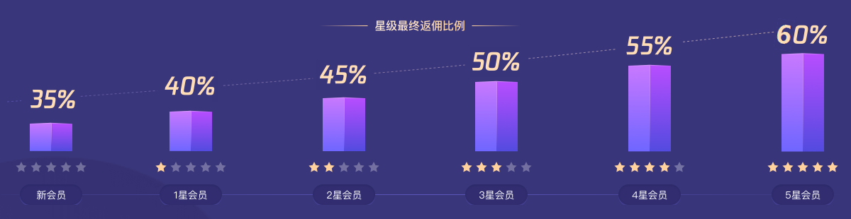 会员星级有6个梯度,星级不同权益不同,星级越高则佣金比例越高